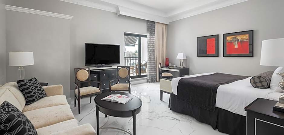 The spacious, 400-square-foot guestroom includes a Juliet-style balcony and European art. An en suite safety deposit box, coffee-making facilities, and a hairdryer are provided. Additional amenities include ironing facilities and plush terry robes.