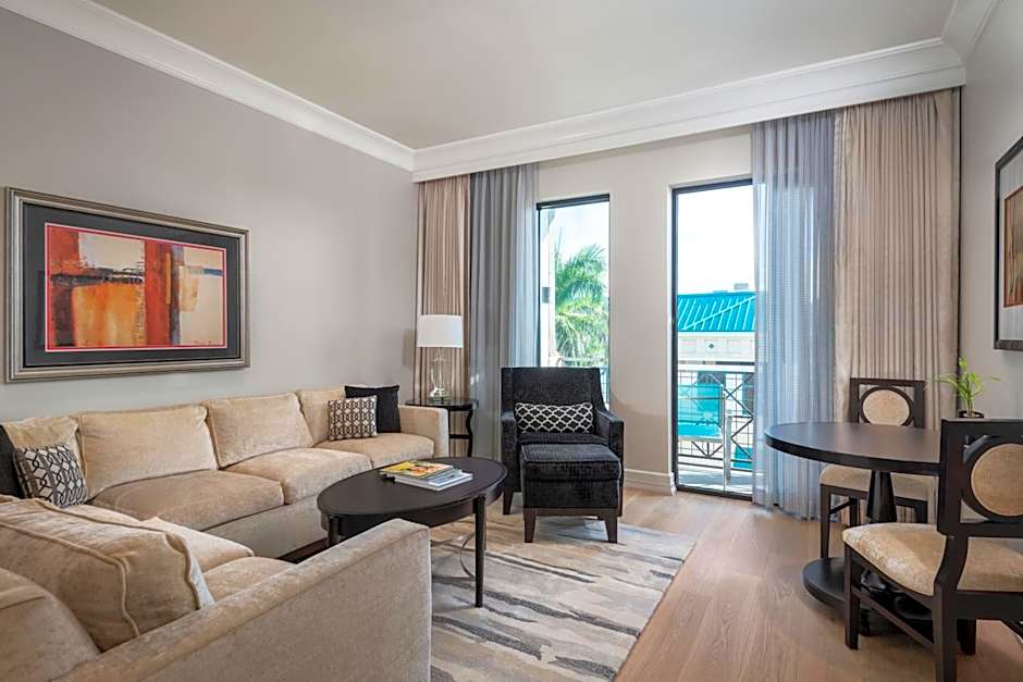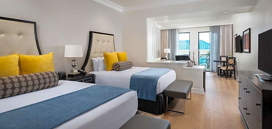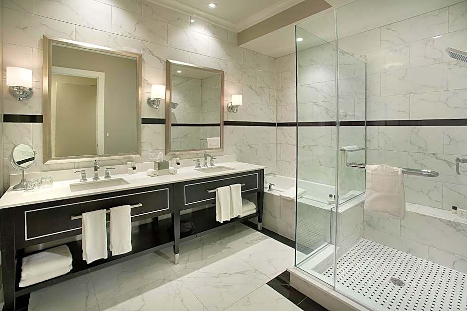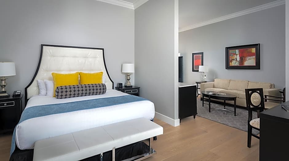 This spacious, 450-square-foot suite includes a Juliet-style balcony that faces Sugden Plaza or a private balcony that faces 5th Avenue South. An en suite safety deposit box, coffee-making facilities, and a hairdryer are provided. Additional amenities include ironing facilities and plush terry robes.